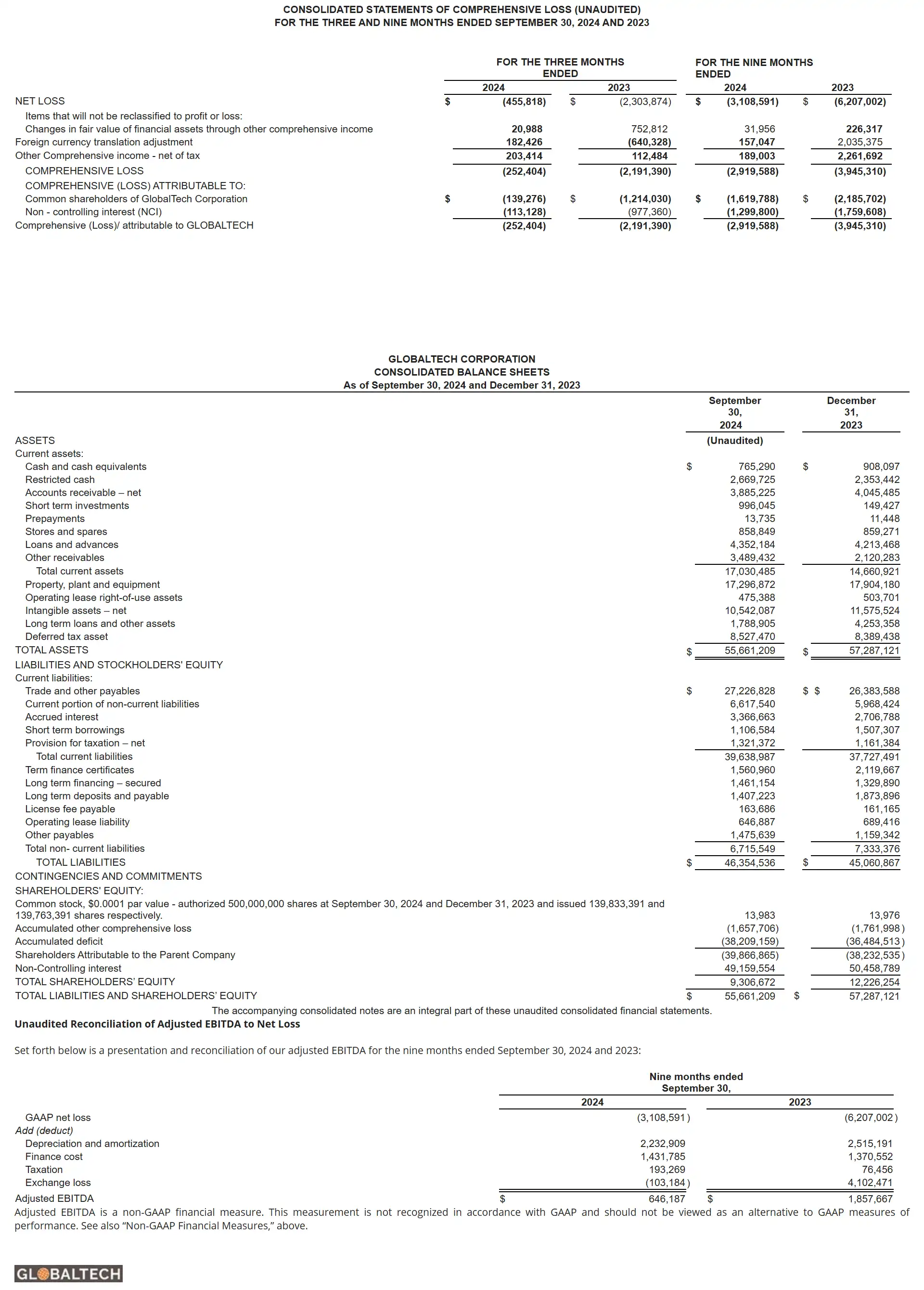 In addition to our results calculated under generally accepted accounting principles in the United States (“ GAAP ”), in this news release we also present certain non-U.S. GAAP financial measures. Non-U.S. GAAP financial measures include Adjusted EBITDA. We have included Adjusted EBITDA in this news release as a supplement to GAAP measures of performance to provide investors with an additional financial analytical framework which management uses, in addition to historical operating results, as the basis for financial, operational and planning decisions and present measurements that third parties have indicated are useful in assessing GlobalTech and its results of operations. Adjusted EBITDA is presented because we believe it provides additional useful information to investors due to the various noncash items during the period. Adjusted EBITDA is also frequently used by analysts, investors and other interested parties to evaluate companies in our industry. Adjusted EBITDA has limitations as an analytical tool, and you should not consider it in isolation, or as a substitute for analysis of our operating results as reported under GAAP. Some of these limitations are: Adjusted EBITDA does not reflect cash expenditures, future requirements for capital expenditures, or contractual commitments; Adjusted EBITDA does not reflect changes in, or cash requirements for, working capital needs; and Adjusted EBITDA does not reflect the significant interest expense, or the cash requirements necessary to service interest or principal payments, on debt or cash income tax payments. For example, although depreciation and amortization are noncash charges, the assets being depreciated and amortized will often have to be replaced in the future, and Adjusted EBITDA does not reflect any cash requirements for such replacements. Additionally, other companies in our industry may calculate Adjusted EBITDA differently than GlobalTech does, limiting its usefulness as a comparative measure. You should not consider Adjusted EBITDA in isolation, or as a substitute for analysis of GlobalTech’s results as reported under GAAP. GlobalTech’s presentation of this measure should not be construed as an inference that future results will be unaffected by unusual or nonrecurring items. We compensate for these limitations by providing a reconciliation of this non-GAAP measure to the most comparable GAAP measure. We encourage investors and others to review our business, results of operations, and financial information in their entirety, not to rely on any single financial measure, and to view this non-GAAP measure in conjunction with the most directly comparable GAAP financial measure.